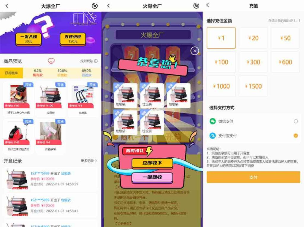 - 自定义设置:平台支持商品的自定义设置,包括中奖概率、回收价格等,且有完整的流程展示、玩法介绍和开奖模式。