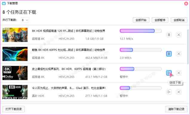 2. 多线程下载:最多支持 8 个线程,便于提升下载速度。