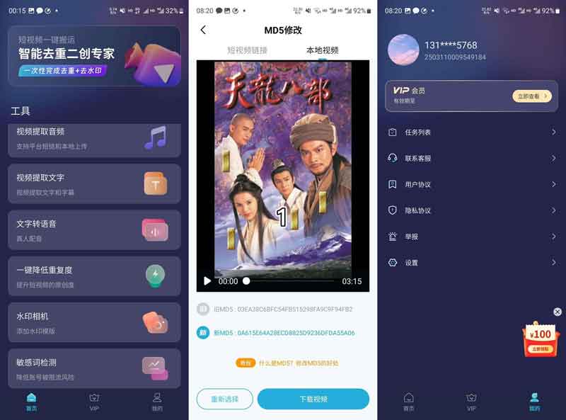 一键搬运短视频是一款短视频全 自动智能处理软件,自带去水印、改MD5码、视频去重、视频编 辑等功能, 视频二次处理伪原编辑工具,一天处理几千视频,解放双手降低成本,已解锁永久 会员!