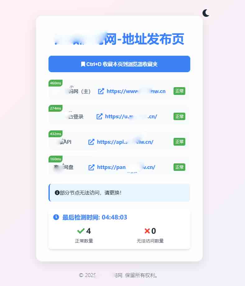 网站源码自动检测网址是否能够正常访问,自动调整为黑天或者白天模式,也可手动切换,主要是页面非常好看。